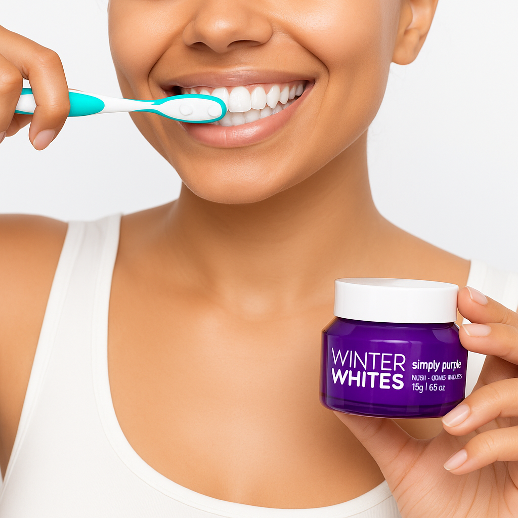 Simply Purple is your instant brightening step—a purple PAP+ powder that uses color-correcting technology to help neutralize yellow tones and make your smile look visibly whiter in seconds. The violet hue sits opposite yellow on the color wheel, softening dull, warm tones on contact while the gentle formula supports a cleaner, smoother look over time, without the harsh feel of traditional whitening tricks.